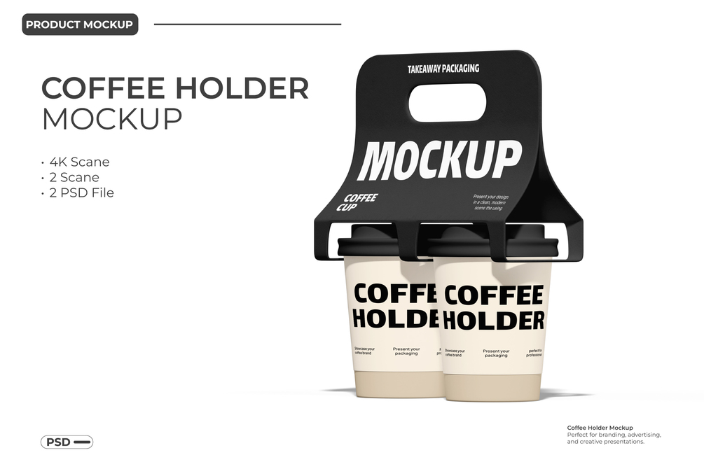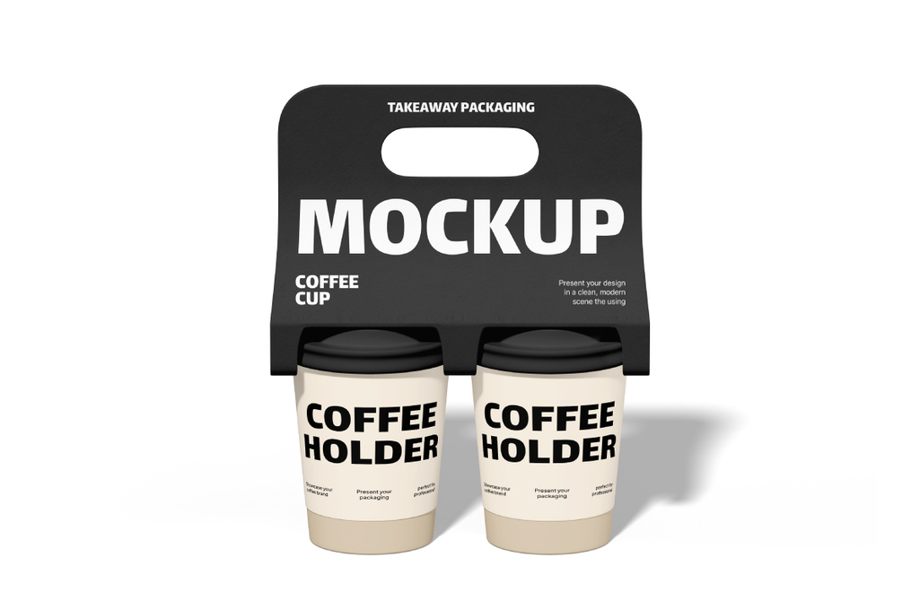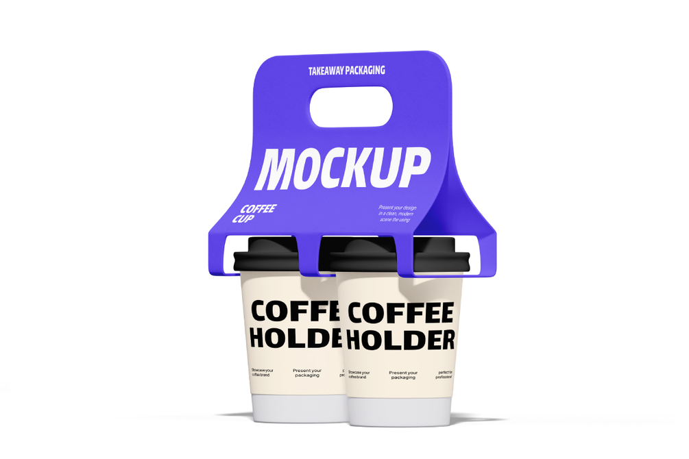 This mockup features a takeaway coffee cup holder with two paper cups, rendered in 4K high-resolution with realistic lighting and shadows. Each PSD file includes smart objects for quick and easy design replacement, allowing you to customize the color, texture, and label in just a few clicks.